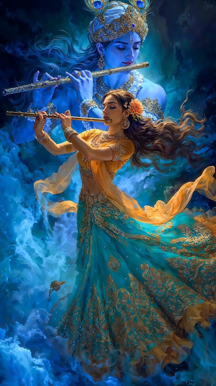 In one scene, Krishna gently plays his golden flute, the sacred instrument whose melody is said to transcend time, dissolve sorrow, and awaken devotion in every soul that hears it. His posture is fluid and graceful, as if he moves with the rhythm of the cosmos. The swirling clouds and luminous background create a sense of otherworldly motion, suggesting that the universe itself dances to the sound of his music. The flute becomes more than an instrument; it is a symbol of divine communication โ a call that draws hearts toward love, peace, and spiritual awakeningThis image stands as a tribute to the eternal spirit of Krishna โ the divine musician, the cosmic lover, the guardian of innocence, and the source of infinite grace. It inspires reflection, devotion, and a quiet sense of peace, encouraging every soul to listen for the sacred melody that flows through the universe and within the heart itself.ย