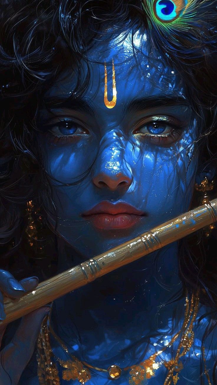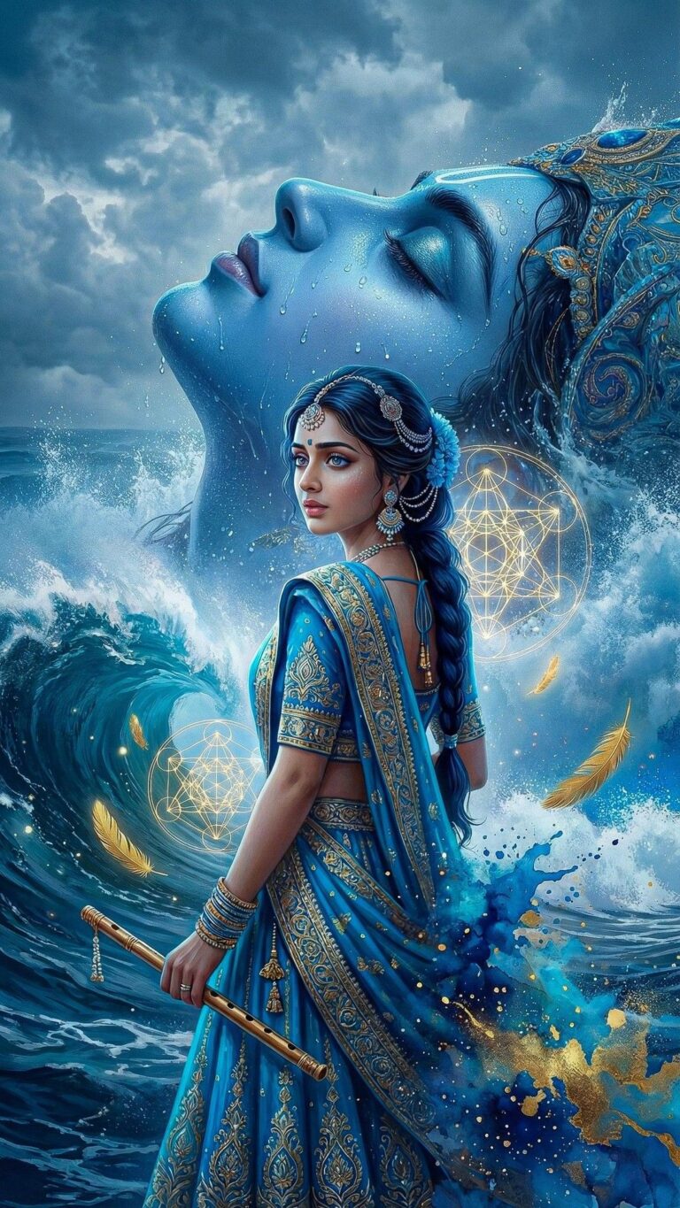 This breathtaking artwork captures the eternal, celestial presence of Lord Krishna in a moment of sublime harmony and divine love. Bathed in a dreamlike aura of deep blues and golden light, Krishna appears as the embodiment of compassion, grace, and cosmic serenity. His radiant blue skin glows softly, symbolizing infinity, divinity, and the boundless depth of the universe itself. Adorned with an exquisite crown of flowers and the sacred peacock feather, he reflects natureโs beauty united with divine elegance. Every detail โ from the intricate jewelry to the delicate floral garlands โ enhances the sacred atmosphere surrounding him.